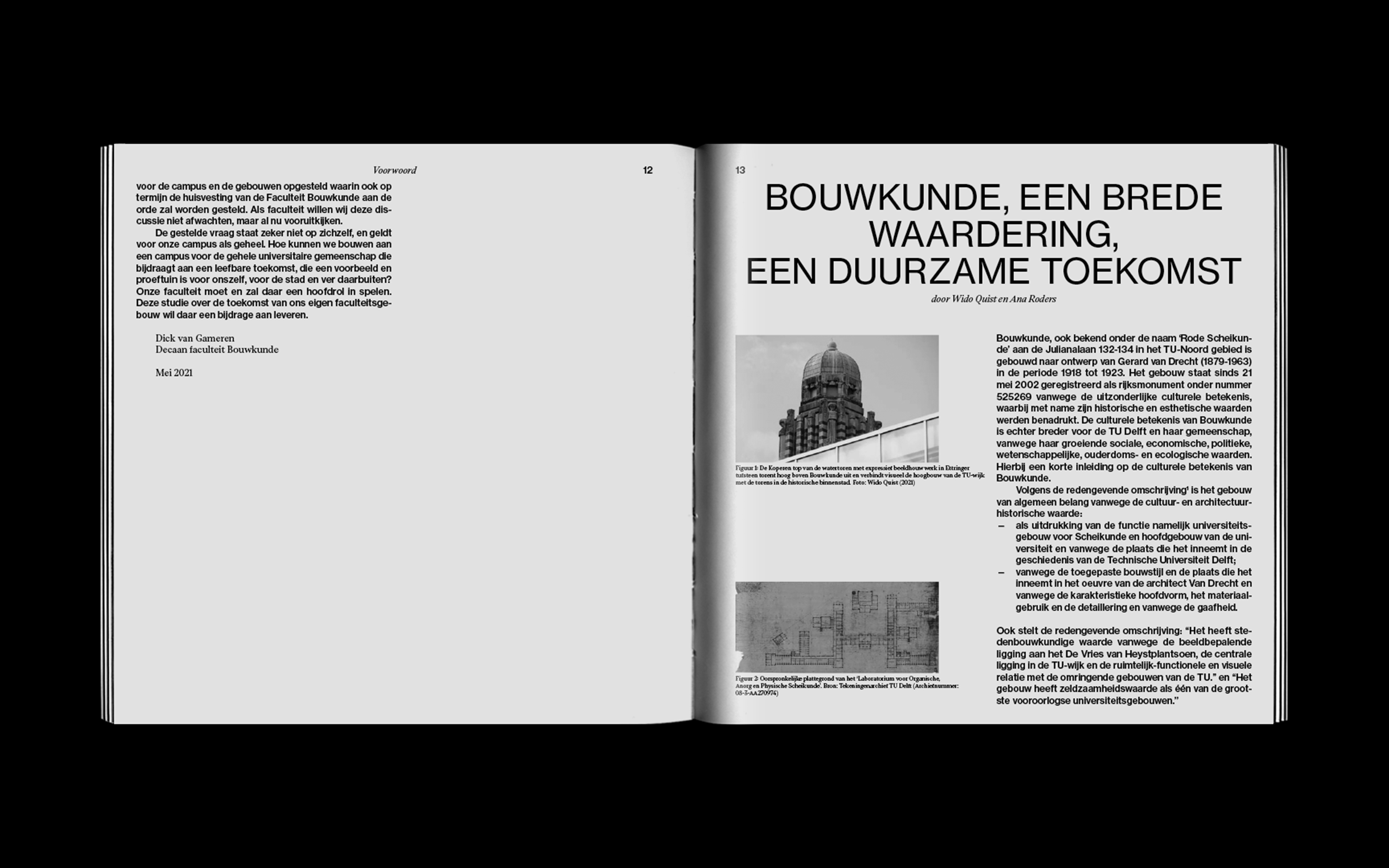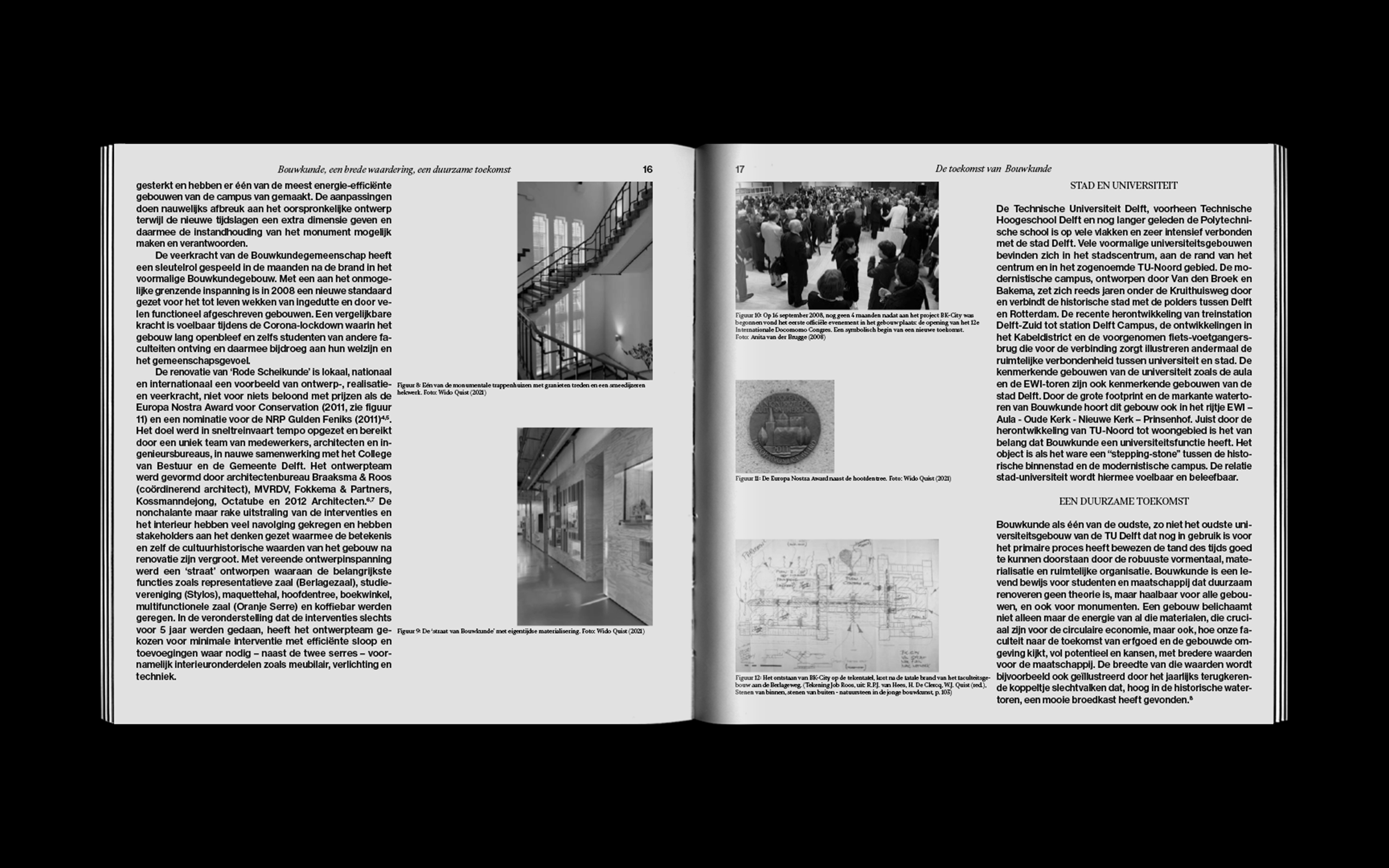 Over the past year, the Faculty of Architecture at TU Delft has released a series of promotional publications. The idea behind these two publications was to maintain the same format as the previous ones while introducing a fresh look. "The Future of Bauwkunde" is a compact publication that delves into the history of the building and its significance for the architecture department. The multi-annual plan was developed with a forward-looking approach while acknowledging the importance of the past. Both publications serve as statements from the director of the architecture department, and through the design, we aimed to effectively convey Dick's ideas.