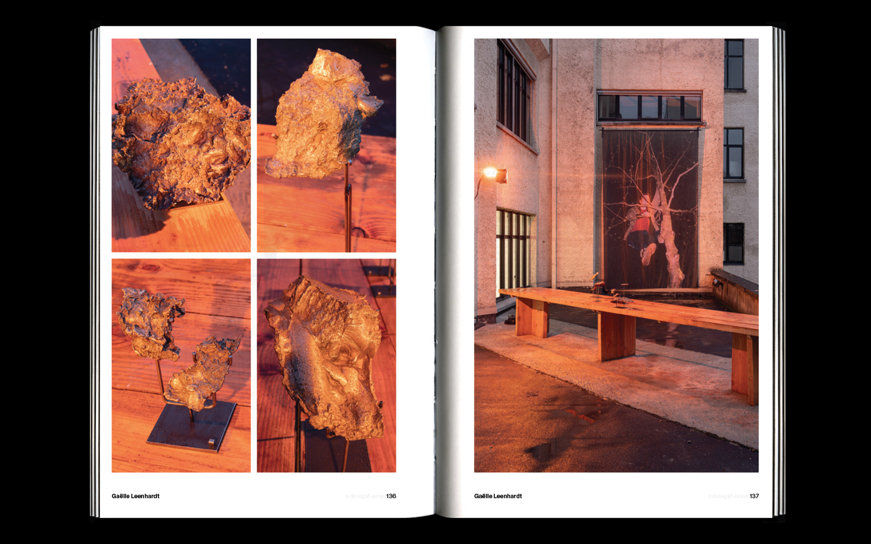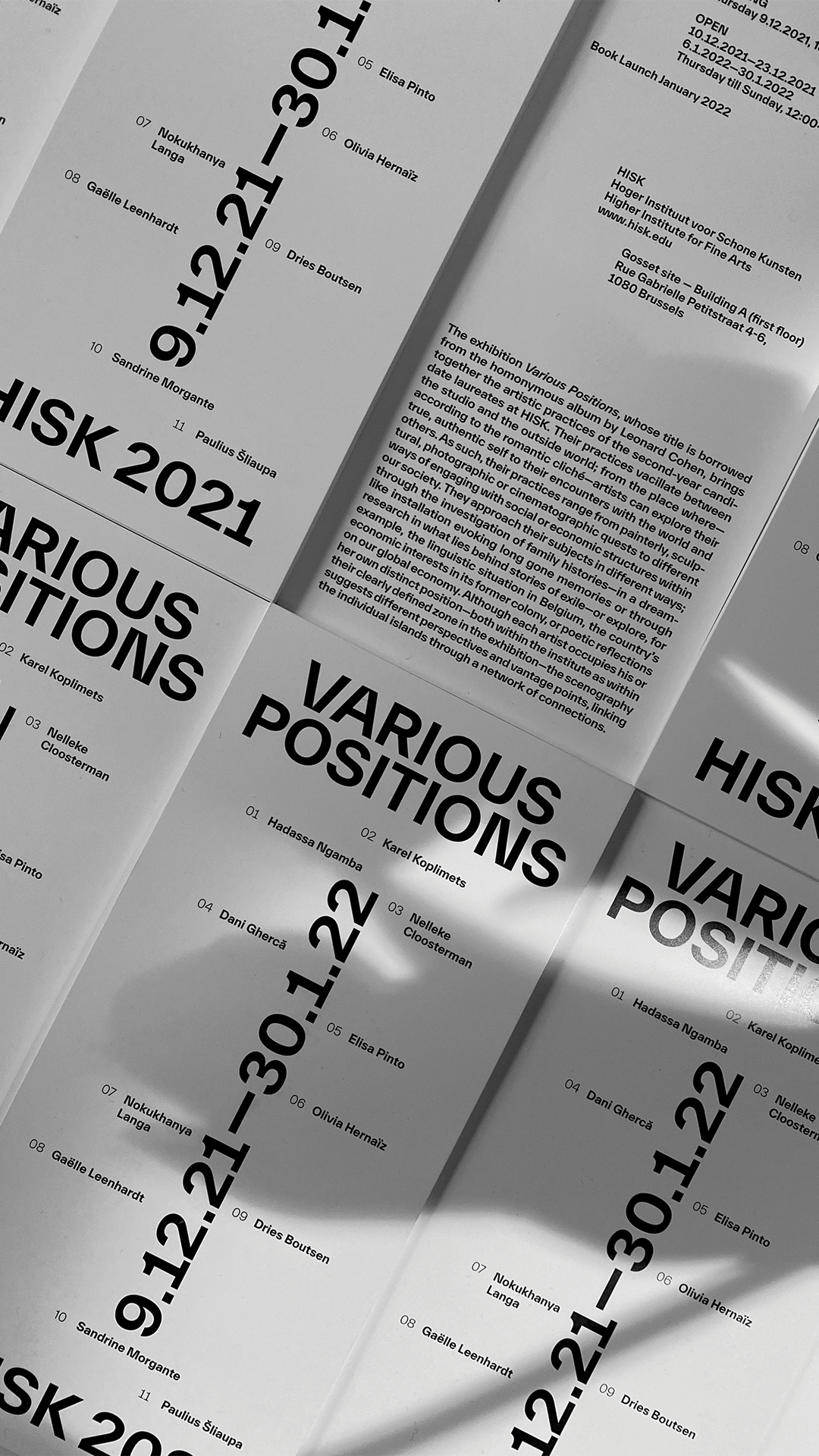 Together with HISK and Sam Steverlynck we worked on the visual identity for the exhibition and the catalog. Our goal was to create something strong and refined that would help showcase the work of each artist. The visual identity was based on the location of the artists in the final exhibition. The publication didn’t only want to focus on the end result, the Laureates Exhibition, but also disclose the genesis of the work, the making-of. Although there is no hierarchy attributed to either of these, and there are more and more other events added to the residents’ calendar—including this year’s “mid term” exhibition, The HISK Affair, curated by Pieter Vermeulen and Sam Steverlynck—the Laureates Exhibition still seems to dominate both the attention economy and the labor/resources that are invested in it. The catalog aims to present both events and treat them equally, by dedicating the same number of pages to each of these key moments—the production and the presentation—and giving them the same importance. It does so by setting up a conceptual mirror game in which both parts of the publication mimic each other in structure while expressing a different energy: the first part, dedicated to the making of the work—or the studio practice—has more of a diaristic, open-ended feeling, offering an unprecedented view of the genesis of the new work in previously-unpublished source material or documents contextualizing the overall practice it stems from. The second part has a more austere feel, functioning as a classic exhibition catalog featuring the finished works. Although both sections were designed by Studio Berga, each has a different look, whether through the analog pictures by Jean-Pierre Stoop that capture the raw energy of the studios in Ghent, or the more restrained pictures of the finished works and installation shot by Dani Ghercă in the Gosset building in Brussels. Although the signature style of the graphic designer is clearly recognizable, Studio Berga was nonetheless able to express two different aspects of his personality, further highlighting the differences between the Open Studios and the Laureates Exhibition, the site of production versus the site of presentation, Ghent versus Brussels.